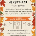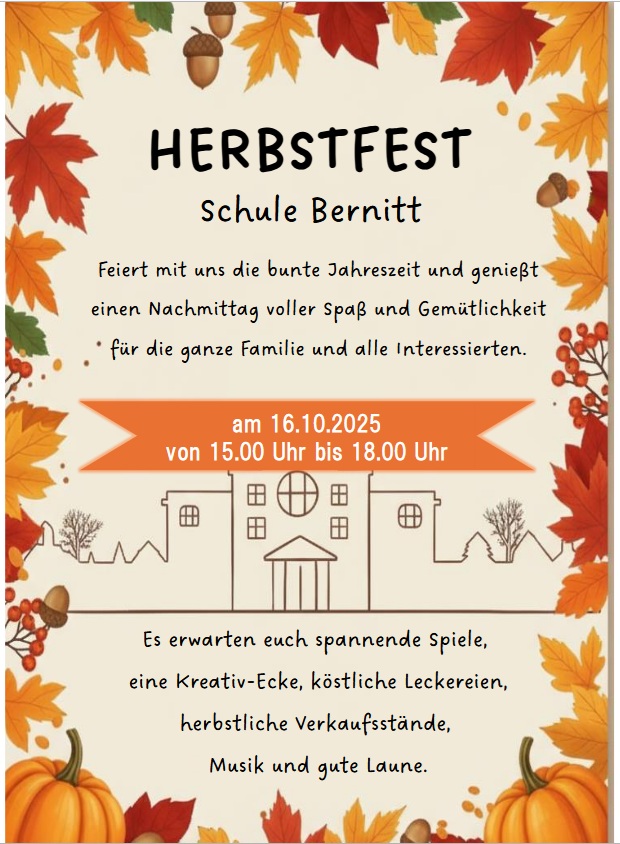 Die Schule Bernitt lädt alle Schüler:innen, Eltern und Freunde am 16. Oktober zu unserem bunten Herbstfest ein. Freut euch auf Spiel, Spaß und herbstliche Leckereien! Außerdem könnt ihr herbstliche Deko erwerben, die unsere Schüler:innen selbst gebastelt haben.